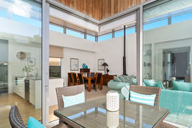 The private patio becomes an extension of the living space as it opens up completely. Commercial grade double glazed corner sliders do the job. Whitewashed Marine ply ceilings add to the finesse of this special living space.