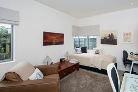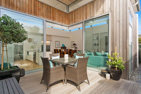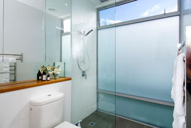 The private patio becomes an extension of the living space as it opens up completely. Commercial grade double glazed corner sliders do the job. Whitewashed Marine ply ceilings add to the finesse of this special living space.